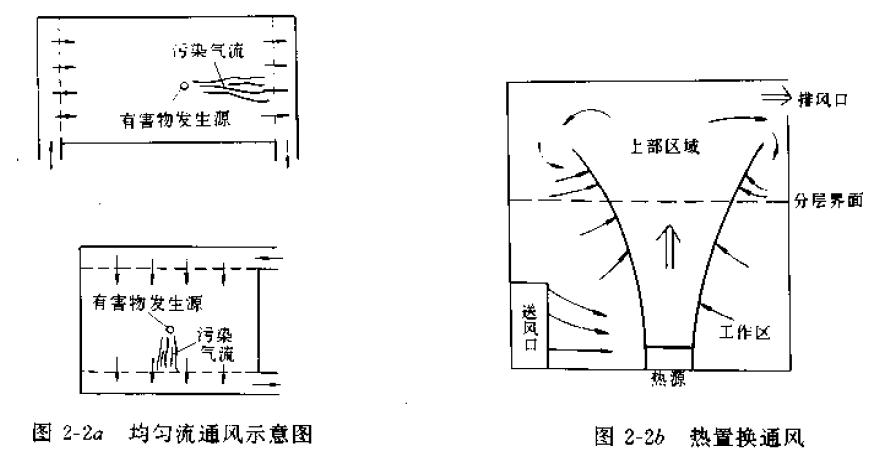 (3)均勻流通風速度和方向完全-一致的寬大氣流稱為均勻流,用它進行的通風稱為均勻流通風。它的工作原理是利用送風氣流構成的均勻流把室內污染空氣全部壓出和置換,如圖2-2a所示。氣流速度原則_上要控制在0.2~0.5m/s之間。這種通風方法能有效排出室內污染空氣。目前主要應用于汽車噴漆室等對氣流、溫度、濕度控制要求高的場合。