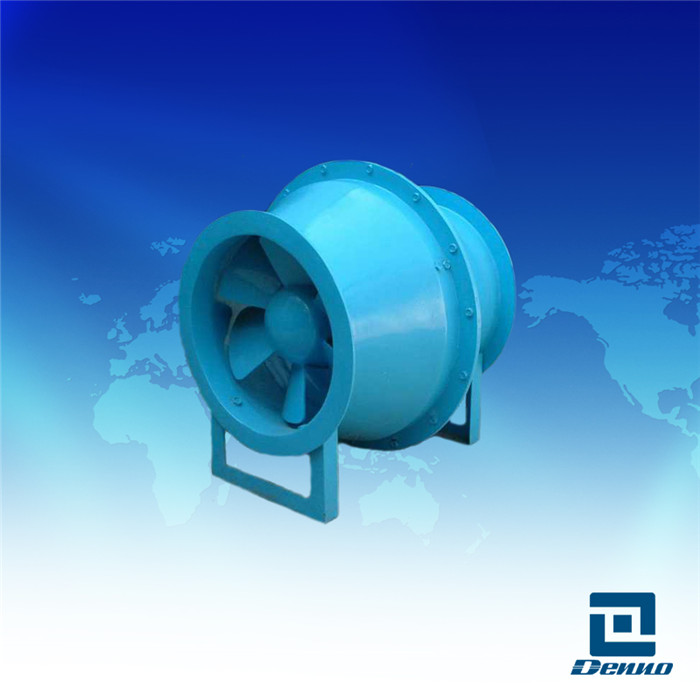 普通離心風機即可滿足排風排煙要求,但大風量離心風機只能安裝在地面,占地較大,需要較大機房,高溫軸流風機為消防專用風機,也能滿足在280°C煙溫下運行30min的要求,而高溫軸流風機體積小,一般可吊裝,若設機房面積也小,實際工程設計中,往往采用高溫軸流風機排煙。下面就高溫軸流風機與普通軸流風機在排煙通風系統的組合應用方面分別討論。