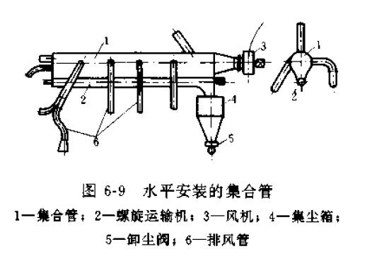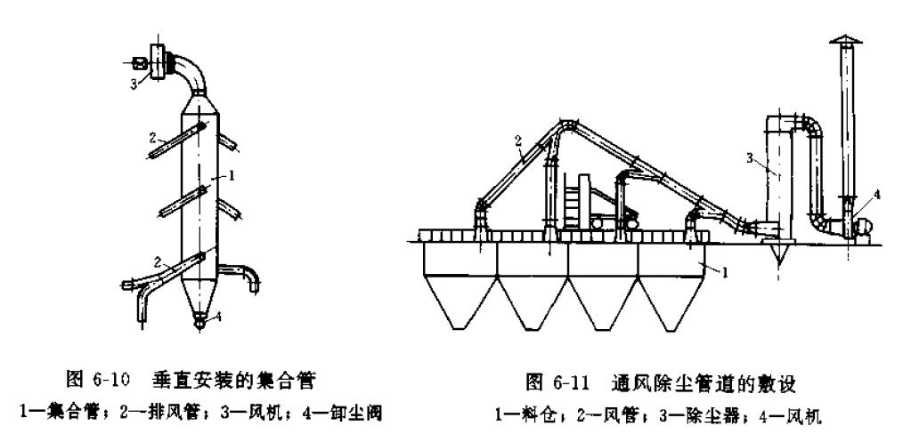 1.除塵系統的排風點不宜過多,與利各支管間壓力平衡。如排風點多,可用大斷面集合管連接各支管。集合管內流速不宜超過3m/s,集合管下部應設卸灰裝置,見圖6-9、 6-10。