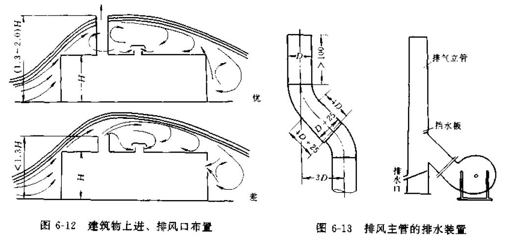 b.通風排氣中的有害物質必需經大氣擴散稀釋時,排風口應位于建筑物空氣動力陰影區和正壓區以上,具體要求見圖6-12。
